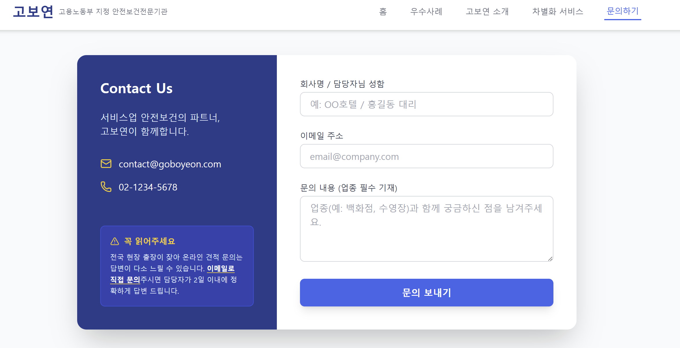 의도적 결핍으로 -> "잦은 출장으로 온라인 견적 문의는 답변이 느리오니 메일로 직접 하시면 2일 안에 답변 드리겠습니다"